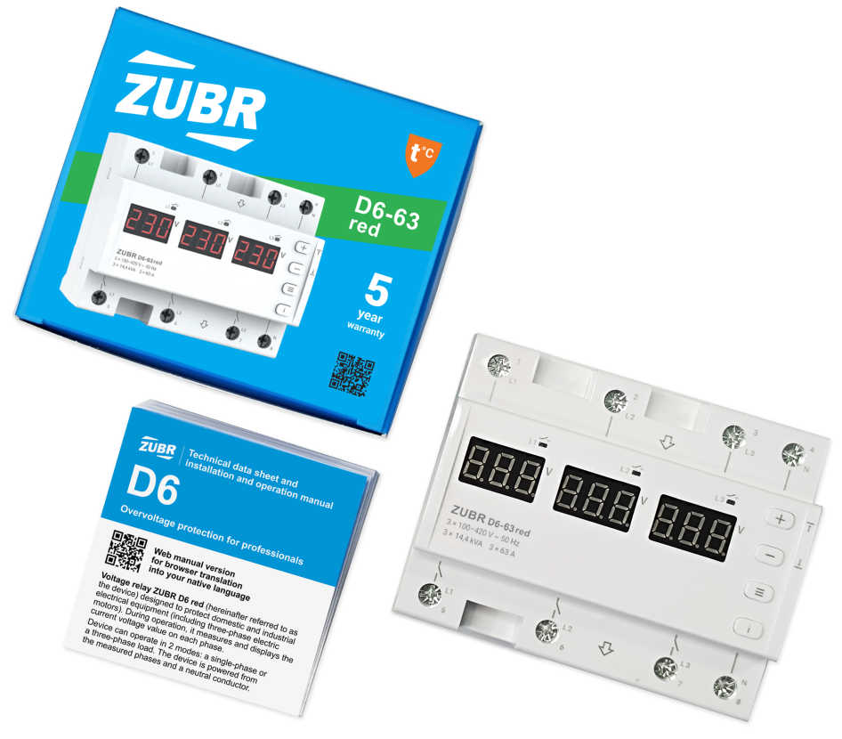 • Basic voltage monitoring relay ZUBR D • Basic with thermal protection ZUBR Dt • With maximum function ZUBR D2 • With maximum function plus current and power control ZUBR CV2 [2 screens] • With maximum function plus current and power control ZUBR MF2 [3 screens] • Three-phase Voltage relays with two modes: single-phase and three-phase load ZUBR D6 • Voltage relay with touch buttons in socket ZUBR SR1 • Voltage relay in socket ZUBR R1 • Three-phase ZUBR 3F